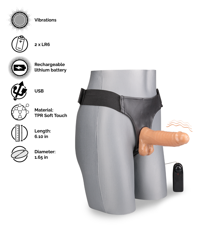 From time to time, a couple's sex life may become routine... But this sex toy will change everything. You can use it with your partner to experiment with pegging in total comfort, thanks to the elastic, adjustable belt. Discover a whole new kind of anal or vaginal penetration by switching on the delicious vibrations, helping you reach orgasm in a matter of minutes. This dildo is made of soft and supple TPR, decorated with testicles and veins and a fat head. It will vibrate at the level of the intensity you choose with its wired remote control.