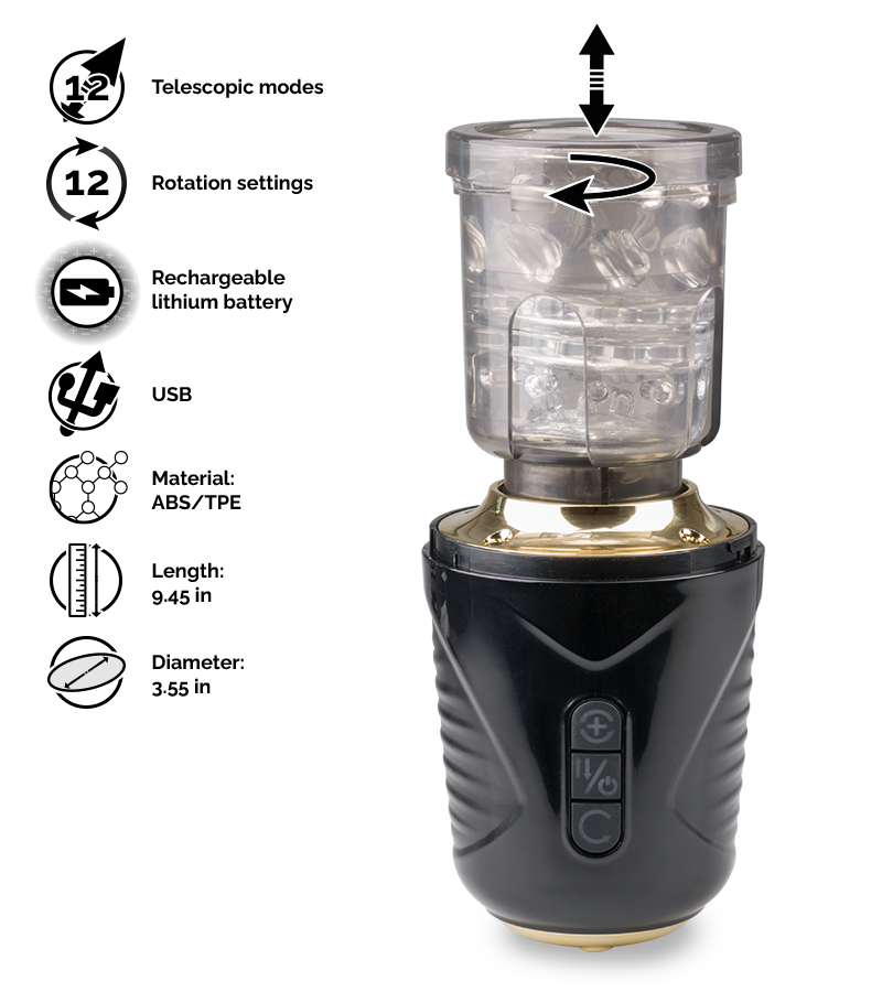 The Tempest thrusting and rotating masturbator is 9.50 inches long with a total diameter of 3.50 inches. Its insertable sleeve has a depth of insertion of 3.25 inches and a 1.75-inch inner diameter. Its battery is rechargeable with the USB cable provided.